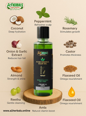 A1 Herbals Nature Touch Hair Growth Oil is a powerful blend of 100% herbal ingredients designed to nourish the scalp, reduce hair fall, and boost fast, natural hair growth. Formulated with Pure Sarso, Coconut, and Castor oils enriched with Aloe Vera, Amla, Kalonji, Onion, Rosemary, Methi Dana, Reetha, Shikakai, Curry Leaves and Baal Charr—this oil strengthens hair from root to tip for thicker, healthier, shinier hair.